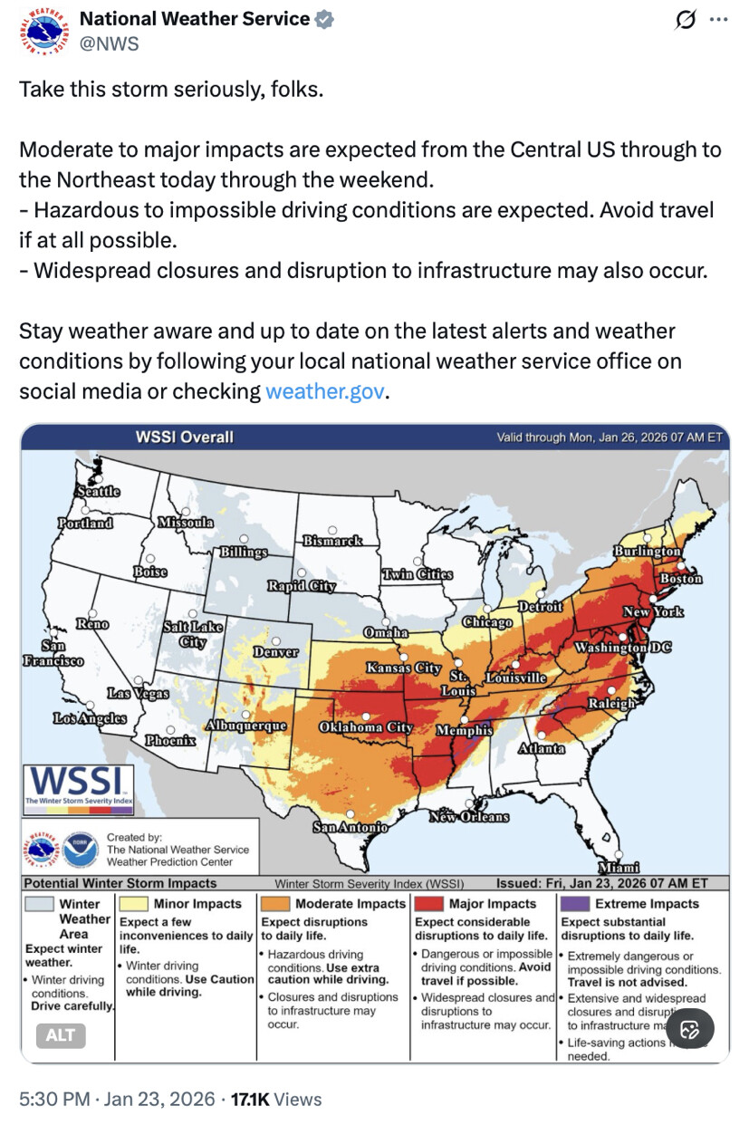 I have been briefed on the Record Cold Wave and Historic Winter Storm that will be hitting much of the United States this weekend. The Trump Administration is coordinating with State and Local Officials. FEMA is fully prepared to respond. Stay Safe and Stay Warm! President DJT